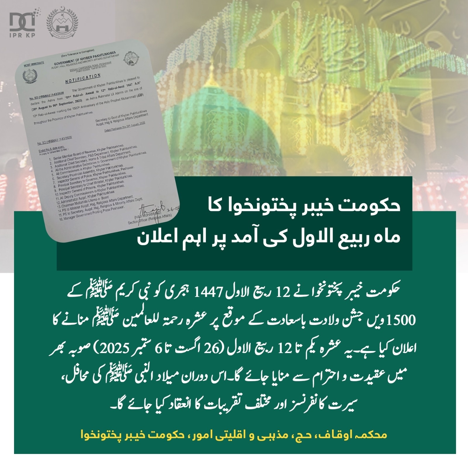 حکومت خیبر پختونخوا نے 12 ربیع الاول 1447 ہجری کو نبی کریم ﷺ کے 1500ویں جشن ولادت باسعادت کے موقع پر عشرہ رحمۃ للعالمین ﷺ منانے کا اعلان کیا ہے۔ اس دوران میلاد النبی ﷺ کی محافل، سیرت کانفرنسز اور مختلف تقریبات کا انعقاد کیا جائے گا۔" محکمہ اوقاف، حج، مذہبی و اقلیتی امور، حکومت خیبر پختونخوا #KPInfo #RabiulAwwal