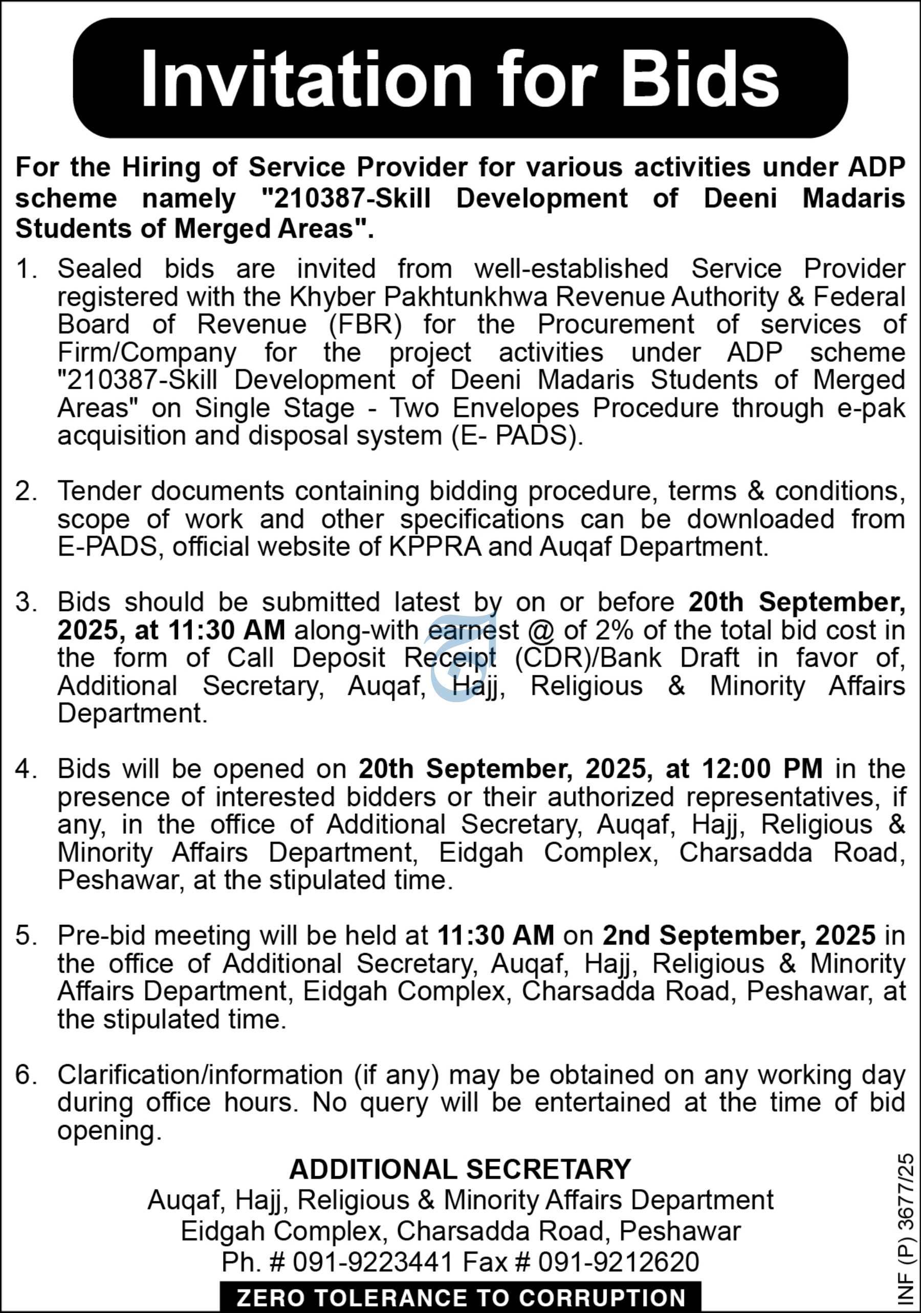 Tender Notice under ADP Scheme No. 210387-Skill Development of Students of Deeni Madaris of Merged Areas | Auqaf | Services | 2025-06-30 | 2025-07-22 | View Details |