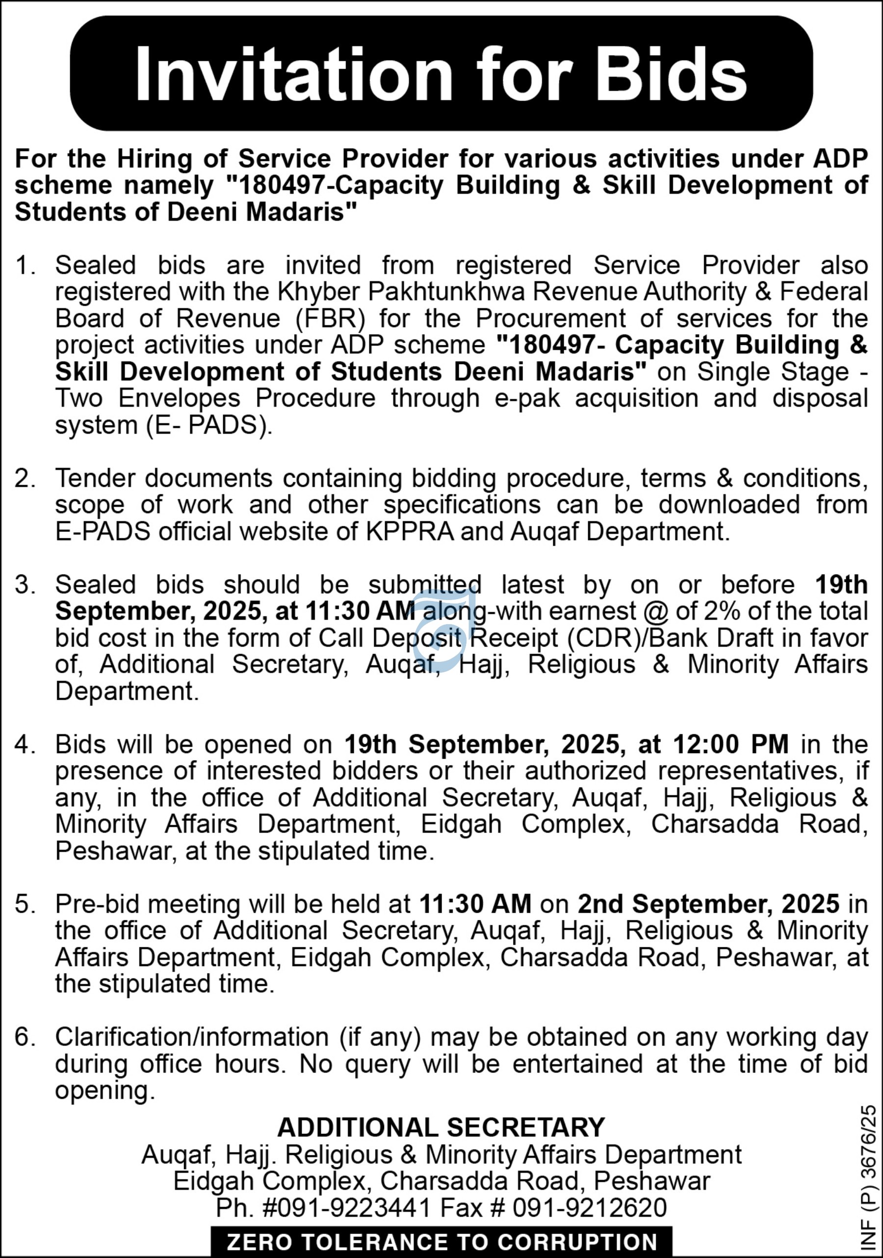 Tender Notice under ADP Scheme No. 180497-Capacity Building & Skill Development of Students of Deeni Madaris | Auqaf | Services | 2025-06-30 | 2025-07-22 | View Details |