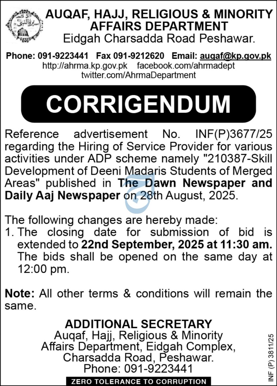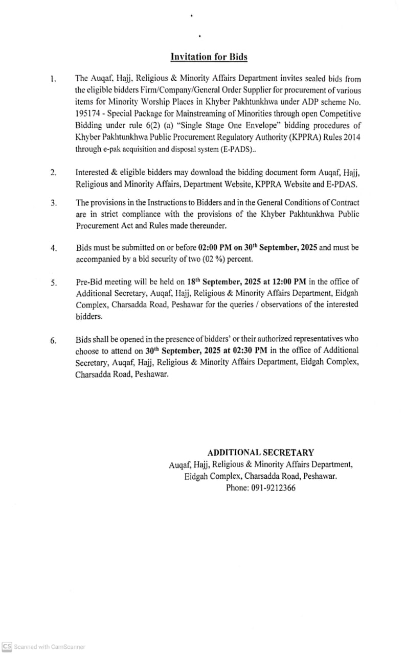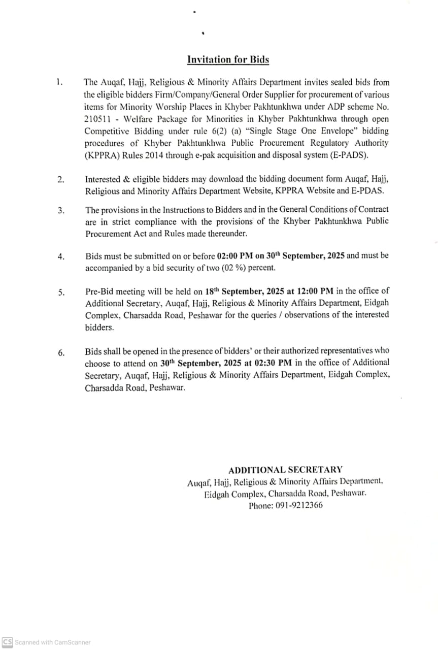 Corrigendum in tender "Establishment of 42 Computer Labs in Deeni Madaris of Khyber Pakhtunkhwa on Pilot Basis " | Auqaf | Goods | 2025-05-30 | 2025-06-12 | Technical Evaluation Report of Procurement under ADP Scheme "Establishment of Computer Lab in Registered Deeni Madaris of Khyber Pakhtunkhwa on Pilot Basis" | View Details |